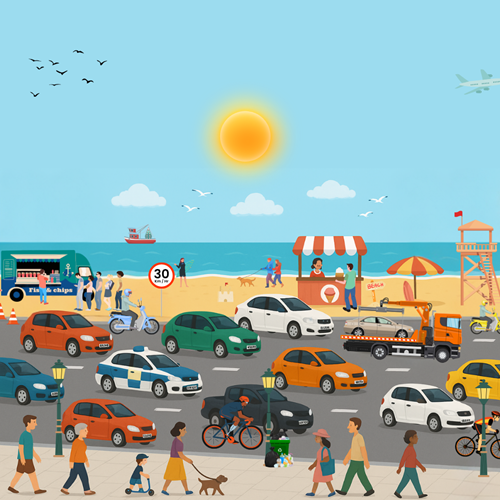 Set against a sunny, bustling beachfront filled with cars, beachgoers, scooters, and seaside snacks, this brainteaser is challenging readers to find the one vehicle with a broken headlight in a sea of summer traffic. Your task is to spot it.