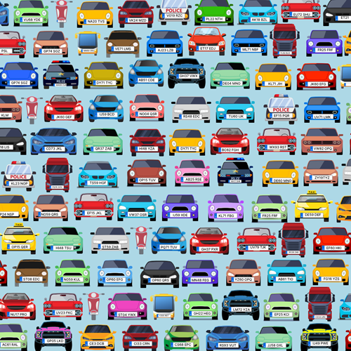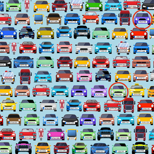 Set against a chaotic background of colourful cars, vans, and lorries, this challenging brainteaser is far from a Sunday drive. At first glance, all the number plates look unique, but two of them are exactly the same. Your job is to spot the matching pair... preferably without stalling.